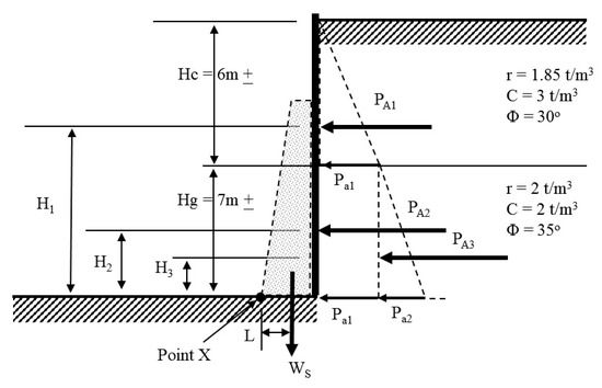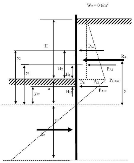 According to Terzaghi’s formula [17], a horizontal soil pressure diagram with a balance condition can be reached, as shown in Figure 12.