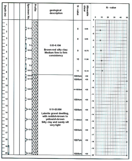 The soil profile in the Linkou district is a laterite–gravel soil (LGS) layer mixed with brown silty and sandy clay, which appears as a red/brown color, as shown in Figure 8. The soil combination is mainly LGS, and the groundwater level in this area is 25 m below ground level (i.e., G.L. −25 m) and did not cause any interference with the excavation work. A total of 16 boreholes were made for standard penetration tests (SPTs) and soil samples were gathered for laboratory testing and analysis before the excavation work began [18]. Figure 9 shows the example of the standard penetration test (SPT) results, and Table 6 shows the simplified soil parameters of the LPHP site, which were based on the 16 holes of the SPT results.