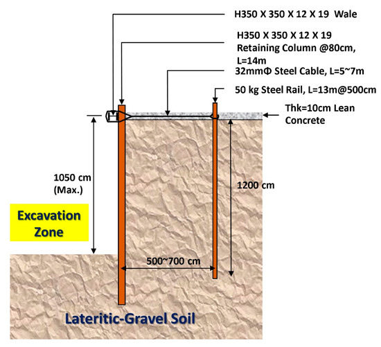 The laterite–gravel soil (LGS) layer might have been softened by contact with water, which would have caused a serious and drastic increase in the active earth pressure and reduced the stability of the retaining system. The risk of collapse of the retaining members would have been increased under this condition. Avoiding the occurrence of this situation, by setting a 20 mm-thick wire-meshed concrete layer to protect against rain water and water from cleaning and other operations, is necessary with an LGS layer, as shown in Figure 11.