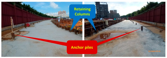 As was already realized, the excavation of the basement construction was typically protected by a vertical retaining system with horizontal steel struts and pin piles, which are shown in Figure 1 and Figure 2. In the LPHP case, due to the triangular shape of the construction site, the horizontal steel strut system was not suitable to be the retaining system. For safety, for the basement excavation of the LPHP the “Anchor Pile with Steel Cable System (APSCS)” method [19,20] was applied; a detailed description of the APSCS is provided in the next section.