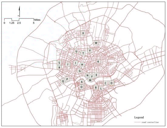 In this study, considering the natural boundaries, urban road separation, form integrity of the areas, etc., the study area was divided into 24 area units of 1.2 km × 1.2 km (labelled A–X) as sub-study areas for performing dimension calculations and analogy research, respectively (Table 1, Figure 2, Figure 3 and Figure 4).