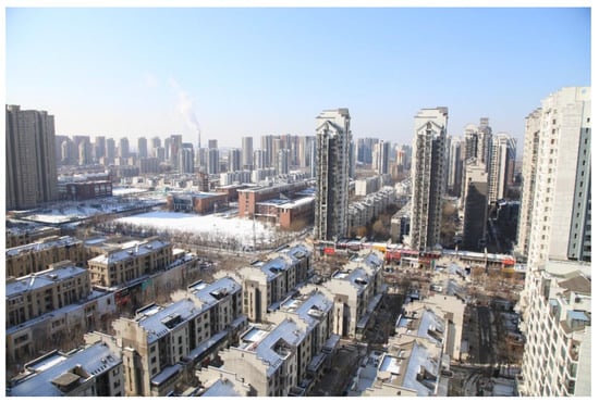 The 24 sample areas selected in this study fully reflect the representative characteristics of the 3D fractal dimension values of city blocks in modern Shenyang. Furthermore, in order to further develop the concrete perception of the 3D fractal value of block form for the construction land index, this study further selected the space on both sides of Hunhe River in Shenyang (one river and two banks) as the research area of the visual form index. This area includes sample areas A, B, C, D, L, and O. By analyzing the clustering relationship between the main land use indicators and the spatial aggregation characteristics, this study explored the general law of modern urban form and guides the planning and design control. It should be pointed out that the study area on both sides of the Hunhe River includes the different morphological characteristics of the renewal and development of the old city (to the north of the river) and the construction of the new city (to the south of the river; Figure 2), and can provide fully representative comparison results of the dynamic evolution of modern urban form in Shenyang (Figure 3 and Figure 4).