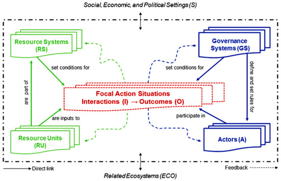 Furthermore, secondary (second-tier) components of the SES framework, consisting of over 50 variables that may affect the outcomes of social–ecological systems, are shown in Table 1. Through the use of the identified SES attributes, consistent with the application spirit of IAD, we can diagnose and explain the complex and uncertain interactions (activities) and the outcome of a situation [39].