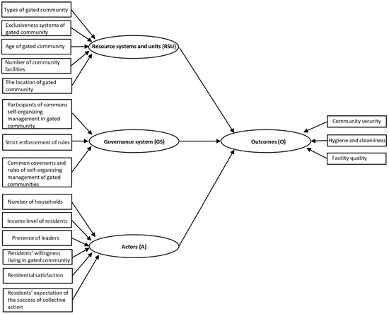 An SES-based conceptual framework is shown in Figure 2, which is the visual expression showcasing interrelationships of second-tier institutional-social-ecological factors with gated communities’ collective action performance. Meanwhile, more detailed information on SES variables in terms of means of investigation, measurement level, and assignation scale is shown in Table 2.