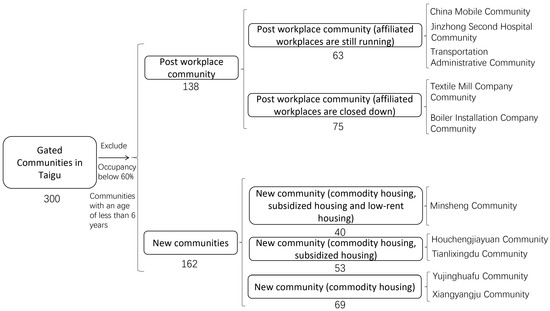 Within the study area, ten gated communities were selected via stratified, purposive sampling. Considering the types of gated communities as a classification standard, the gated communities in Taigu were divided into two categories and five sub-categories, and using this as a foundation, the gated communities with a resident occupancy ratio less than 60% and an age of less than six years which have relatively new facilities and an associated community management system that may have not yet fully matured are excluded. Other aspects of gated communities were considered as well, such as location, management mode, size, etc. Building a foundation upon the above conditions through the stratified purposive sampling process, five “post workplace communities” and “new communities” were separately screened out by stratified purposive sampling. The stratified purposive sampling process is shown in Figure 4.