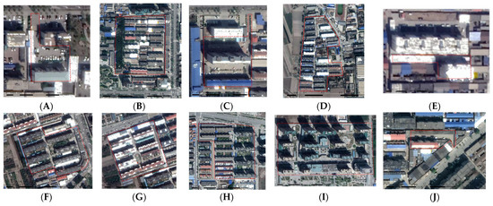 Aerial photos of the ten gated communities. (A) China Mobile Community; (B) Jinzhong Second Hospital Community; (C) Transportation Administrative Community; (D) Textile Mill Community; (E) China Mobile Community; (F) Minsheng Community; (G) Houchengjiayuan Community; (H) Tianlixingdu Community; (I) Yujinghuafu Community; (J) Xiangyangju Community.
