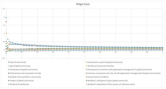As shown in Equation (1), when is not the column non-singular matrix, or the linear correlation amongst some columns is relatively large, the determinant of is close to zero; that is, is close to the singularity. At this time, the error in calculating will be large, the ordinary least-square method lacks stability and reliability. In order to solve the above issue, we need to transform the unsatisfiability problem into a satisfiability problem by adding a regularization term to the above loss function. Thus, Equation (2) derived from Equation (1) helps address the collinearity issue among independent variables. As shown by Equation (2), with the increase of , the absolute value of tends to be smaller and smaller, and when goes to infinity, goes to zero, and the trace that changes with the change of is called ridge trace. In the actual calculation, when the trace tends to be stable, the corresponding value is the penalty to be taken. A prerequisite worth mentioning is that the least-square estimation requires the dependent variable to be a numerical variable. As a modification of the least square estimation, the dependent variable of the ridge regression model also needs to meet this requirement, and the measurement level of residents’ collective action performance in this study accords with this prerequisite.