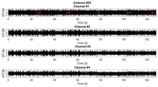 where the summation is carried out on the variable , i.e., the time lag for the estimate of the autocorrelation sequence, for each discrete timestamp. For this application, the number of time lags considered to estimate the instantaneous ACF was set as equal to half of the signal length (that is to say, being the signal divided in subsequent frames, to half of each frame length).
