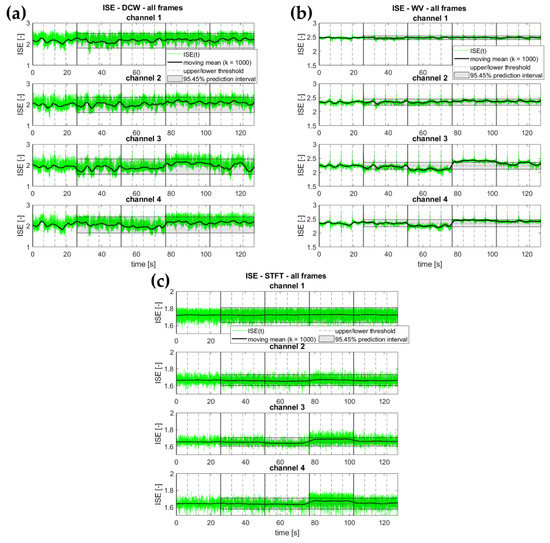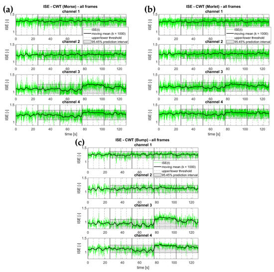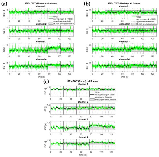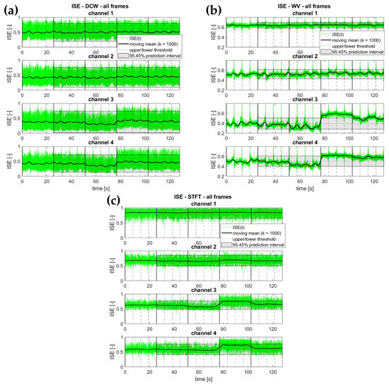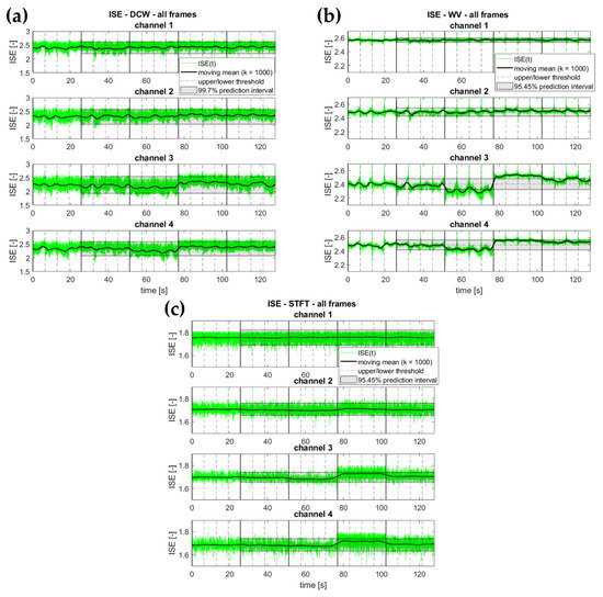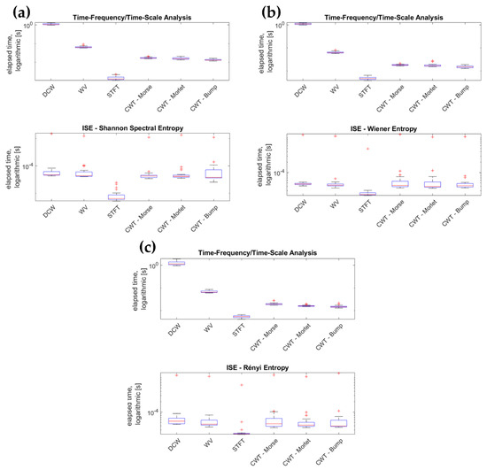Figure 12 shows the boxplot diagrams for all combinations, considering separately the TF/TS representation and the ISE calculation from it. As it can be seen, the TF/TS transform was the ‘bottleneck’ of the whole procedure, independently of the specific entropy definition applied. The actual calculation of the ISE did not significantly slow down the execution, being one to two orders of magnitude faster. Please notice that the time axis is reported on a logarithmic scale in Figure 12. Indeed, the DCW performed significantly slower than the other approaches. Consider also that the STFT is only apparently much faster than the other approaches due to the fewer calculations performed. All of the other algorithms were set to return consistent TF/TS representations, i.e., an -by- matrix, where is the number of frequency samples (for DCW and WV) or scales (for CWT), and is the number of time samples in the provided time history. For the chosen frame duration and considering only frequencies up to (80 Hz) to avoid any alias issue, this corresponds to 40,960 elements in the matrix. On the other hand, with the settings described in Section 3, the STFT returned 20-by-1021 elements (totalling 20,420). Nevertheless, further increasing the resolution in both the time and/or frequency domain did not noticeably improve the effectiveness of the STFT results, which remained poor overall, as previously mentioned.