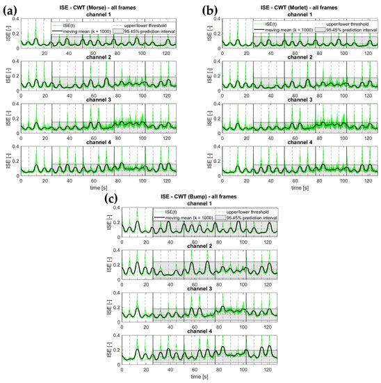 As their main feature, wavelets can be depicted as brief oscillations, i.e., time-limited (as in this application here) or space-localised small wave-like functions. This is profoundly different from harmonic functions, such as sines and cosines, which span unaltered from to and thus do not allow for time resolution. For this and other reasons, the (discrete or continuous) wavelet transform is known to be more able to adapt to random and/or nonstationary signals than Fourier transform [43]. In turn, this can be used, e.g., to depurate the signal of measurement noise or to separately investigate the underlying linear and/or stationary components (by discarding the nonlinear/nonstationary components). For instance, it was demonstrated experimentally in [44] how the CWT-extracted entropy can be used to detect small damages (e.g., a 5% reduction on bolt-tightening torques).