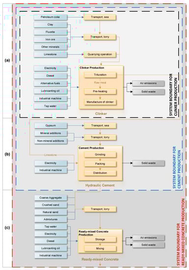 Material and energy inputs to produce clinker, cement, and concrete were obtained from plants’ sustainability reports. Access was provided to the data of the registering system of raw materials consumption, fuels, and electricity use in each phase of the three systems. Monthly emission data for CO2, NOx, SO2, PM, and VOCs was obtained from the continuous emission-monitoring system of each clinker kiln. Pollutant emissions such as ammonia, antimony, arsenic, benzene, cadmium, hydrogen chloride, cobalt, copper, chromium, dioxins, mercury, carbon monoxide, nickel, lead, thallium, and vanadium were obtained from the biannual measurement reports of each clinker kiln. Reports on the consumption of oils, heavy machinery, and maintenance equipment were obtained from logistics records. The average production of the last five years was used, and a life span of 50 years was used to include the construction of the production plants.