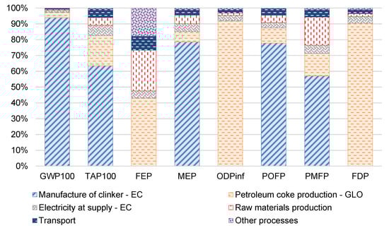 The result for ODPinf is 4.51 × 10−5 kg CFC−11-Eq/ton of clinker, and for FDP, it is 86.48 kg oil-Eq/ton of clinker. The dominant process in ODPinf is producing petroleum coke, and it is also dominant for the impact category FDP. Regarding POFP, the most contributing process is clinkerization, with 77.8%, due to the VOC in the gases emitted from the clinker kiln. García-Gusano et al. (2015a) obtained as a result 1.24 kg NMVOC-Eq/ton of clinker [41], a value close to the result of this study: 2.08 kg NMVOC-Eq/ton of clinker. The result for PMFP, 0.65 kg PM10-Eq/ton of clinker, is due to primary aerosols, such as PM, and secondary aerosols, such as SO2, NH3, and NOx, present in the flue gases from clinkerization.