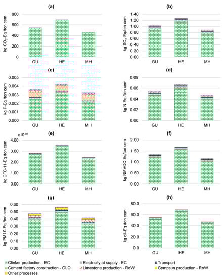 Characterization results for impact categories. The graphs show the impact results per ton of cement (functional unit) by type: GU: General use, HE: High early strength, and MH: Moderate Heat of Hydration, and a contribution analysis for processes. (a) Global warming potential—GWP100; (b) Terrestrial acidification potential—TAP100; (c) Freshwater eutrophication potential—FEP; (d) Marine eutrophication potential—MEP; (e) Ozone depletion potential—ODPinf; (f) Photochemical oxidant formation potential—POFP; (g) Particulate matter formation potential—PMFP; (h) Fossil depletion potential—FDP; EC—Ecuador; GLO—global; and RoW—Rest of world.