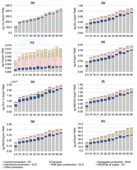 Characterization of results for impact categories. The graphs show the impact results per m3 of ready-mixed concrete (functional unit) with compressive strength between 2.5 and 80 MPa and a contribution analysis for processes. (a) Global warming potential—GWP100; (b) Terrestrial acidification potential—TAP100; (c) Freshwater eutrophication potential—FEP; (d) Marine eutrophication potential—MEP; (e) Ozone depletion potential—ODPinf; (f) Photochemical oxidant formation potential—POFP; (g) Particulate matter formation potential—PMFP; (h) Fossil depletion potential—FDP; RMX: ready-mixed concrete; EC: Ecuador; GLO: global; and RoW: Rest of world.