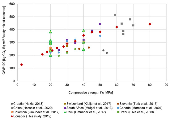Figure 5 shows a comparison of Global warming potential—GWP100 results between this research and previous results in the literature with compressive strengths of 20 to 70 MPa [49,50,51,52,54]. The study by Hossain et al. [48] of concrete in China analyzes compressive strengths between 59 and 70 MPa.
