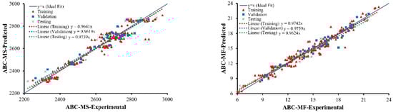 , denote the ith predicted, experimental, mean predicted and mean experimental values, respectively, and the symbol n denotes the total number of values in the dataset used for the development of the models. The training and testing sets are denoted by abbreviations T and TE, respectively. An accurate model has a high R value, while the statistical errors are low. R has been recommended by the researchers to assess the linear dependency among input and output parameters [