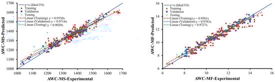 The value of R lies in between 0.90 and 0.98 for MS and MF of ABC and AWC. MAE ranges from 24.64 to 36.94 kg for MS of ABC and AWC, while it ranges from 0.31 (0.25 mm) to 0.71 (0.25 mm) for MF of ABC and AWC.