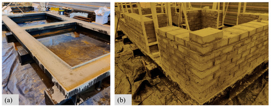 Reduced-scale extruded adobe brick was used with mud mortar to construct three building models: one without a band, one with a timber seismic band, and one with a reinforced concrete band. The schedule for building construction was planned such that the construction of all the buildings could be carried out simultaneously on the metallic frame placed on the laboratory floor. The construction started by casting 25 mm of plain concrete on the metallic frame as shown in Figure 3a. The remaining millimeters of the metallic beam flange were used to lay the first layer of brick so that sliding at the interface between the concrete and the first mortar joint could be prevented during the test. For the construction of the buildings, the metallic frame did not lay on the floor but on timber parts to allow for its elevation for the displacement of the samples (Figure 3b).