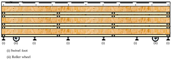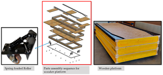 A wooden platform was designed to roll the models onto the shake table easily. To make this possible, its height matched the height of the table. The maximum dead load for this experimental work was 4.8 tons, which was used for the selection of platform components. The additional factor of safety was taken into consideration as this platform is reusable. The wooden platform was built using timber beam and Oriented Strand Board (OSB) panels as shown in Figure 4. It consists of four spring-loaded rollers placed at the corners, three layers of timber beams, and OSB panels placed over each level of timber beams. The model ‘L600.B90.125’ from MiSUMi was used with each roller. The assembly sequence is shown in Figure 4. Two metallic rails were screwed onto the top of the platform to guide the roller of the metallic base frame while moving the building model onto the shake table. The spring-loaded rollers shown in Figure 4. are designed to allow one to move the empty platform. When the building is on the platform, its dead load makes the rollers vanish to help keep the whole platform stable. The entire load is finally supported with the help of 16 swivel foot steel components (model: K0742.006514X75) placed on the bottom layer as shown in the part assembly sequence (see Figure 5). The maximum static load capacity of each swivel foot steel component is 20 kN.