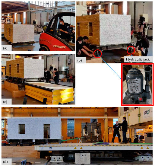 - The next step was to lift the model building vertically and to elevate it high enough to place the wooden platform under it. To elevate the building model, initially, four farm jacks, each with a maximum capacity of 3 tons, were used. However, this approach was not effective due to the lack of stability of the farm jacks for displacement intervals of 20 mm for each lift. Therefore, to improve this process, four hydraulic car jacks, each with a capacity of 2 tons, were used to elevate the building models vertically. The four hydraulic jacks were placed at the four external metal supports. The elevation operation was manually synchronized by counting the pumps (see Figure 6b). The building was elevated in steps of 3–4 cm on all sides simultaneously, and timber blocks were placed under the extended metallic support (see Figure 2) to hold the building in position before beginning each new elevation cycle. Timber blocks were used for security (if one jack had a problem, the building fell only a few centimeters) and because of the limited vertical displacement of the hydraulic car jacks;