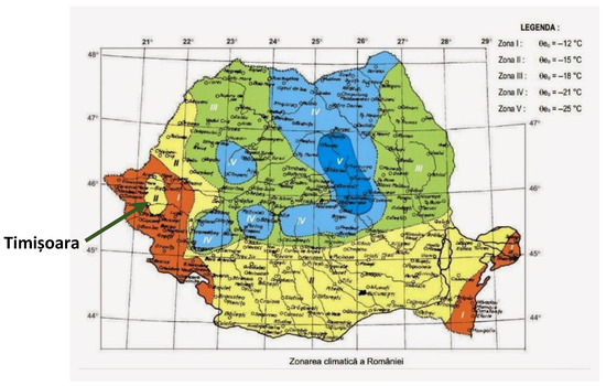Five climatic zones define the exterior climate of Romania (see Figure 3), starting from the 1st zone with an exterior temperature θe = −12 °C, up to the 5th zone characterised by a θe = −24 °C [20]. The city of Timișoara is located in the second climatic zone defined by an exterior temperature in the winter period θe = −15 °C. The annual average temperature in Timișoara is 11.4 °C, with an average exterior relative humidity of 72.1% [21]. The coldest winter day is defined by a daily average minimum exterior temperature of −12.6 °C. For the summer period, the average maximum daily exterior temperature is 29 °C.