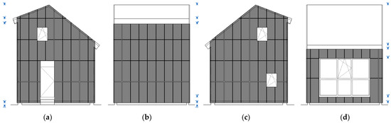 The LSF structure is a two-story modular construction, with a 5 m long span, a 5 m long bay, 3.80 m eave height (on the southern side), and 6.10 m eave height (on the northern side) 6.95 m ridge height (see Figure 4). The eastern façade has two 0.76 m × 0.96 m window openings, the southern façade integrates a 3.56 m × 2.73 m glass curtain opening, while the western façade has a 0.76 m × 0.96 m window opening and a 0.97 m × 2.73 m door opening. There are no openings on the northern side of the building. The access to the second floor is ensured by a 1 m × 1 m attic scuttle door. External photo-voltaic shading lamellae will protect the curtain wall from the sun. The southern side of the roof was designed with a roof pitch of 42° to gain an optimal performance of a roof-mounted solar energy system.
