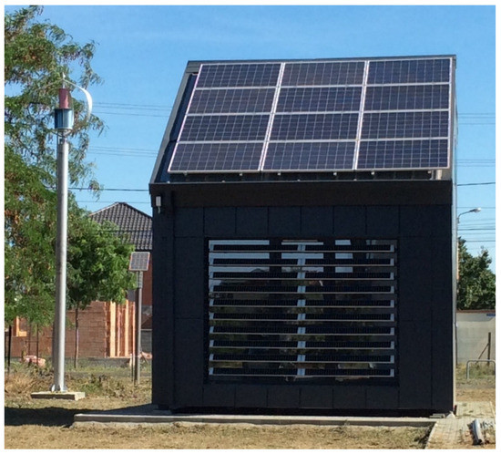 The experimental module was designed following a holistic approach to significantly reduce the energy demand of the building in its operation phase. Therefore, the building envelope design is crucial to meet this objective. At the same time, the design considered the natural light intake and the additional artificial lighting covered by the available LED light sources. The employed renewable energy solutions are based on harvesting solar and wind energy. Therefore, there were installed twelve 250 W polycrystalline cell panels that intake solar energy, with an estimated amount of solar energy produced on-site of 1269 kWh/year (the potential production of the installed polycrystalline cell panels under ideal conditions is 3427.29 kWh/year [26]), and a 1 kW vertical wind turbine.