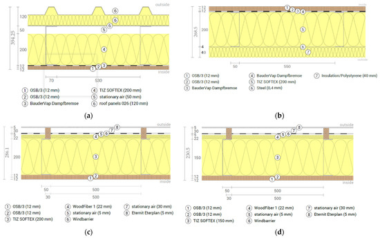 LSF construction elements cross section: (a) roof; (b) ground floor above crawl space; (c) exterior wall north; (d) exterior wall—east and west. Reprinted from [22].