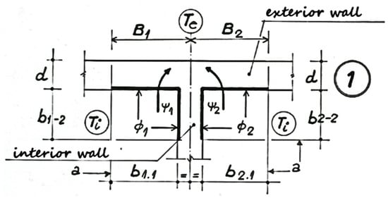 For the intended research, the ψ value was calculated for each junction as a total value for the assessed junction and also divided in two values, i.e., ψ1 and ψ2, each being allocated to one of the modelled wings of the junctions. The need to calculate the two ψ values is following the next calculation steps when the thermal performance of each building envelope element is calculated. This approach is defined in Annex G and Annex J of the Romanian design norm C107/3 [31], which describes the proper approach in reaching the two values. An example of this approach is given in Figure 7.