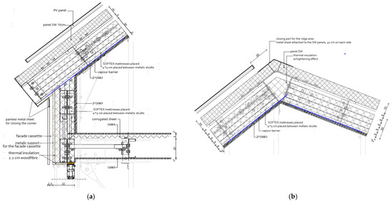 An extended presentation of the details from Figure 6 is provided in the next paragraph. Oriented strand board (OSB) panels (24 mm thick) were used as an inner sheeting layer for walls, ceilings and floors. As a thermal insulation material, the recycled-PET thermal wadding was placed between the steel frame, with a thickness of 150 mm, except for the north exterior wall, with 200 mm thick. The exterior wall constructive detail includes a layer of wood fibreboards of 22 mm thick next to the recycled PET thermal wadding, finished by a layer of fiber cement plate of 5 mm thick. The ground floor was elevated 400 mm from the terrain, avoiding moisture retention from the ground. The constructive detail is designed with 200 mm thick recycled PET thermal wadding. A trapezoidal steel sheet of 4 mm thick is placed underneath, and another continuous exterior layer of 40 mm of extruded polystyrene (XPS) closes the element at the exterior bottom side. Polyvinyl chloride (PVC) membranes waterproofed both the floor and roof. The thermal insulation system was completed on the roof in the exterior with PIR sandwich panels of 120 mm thick.