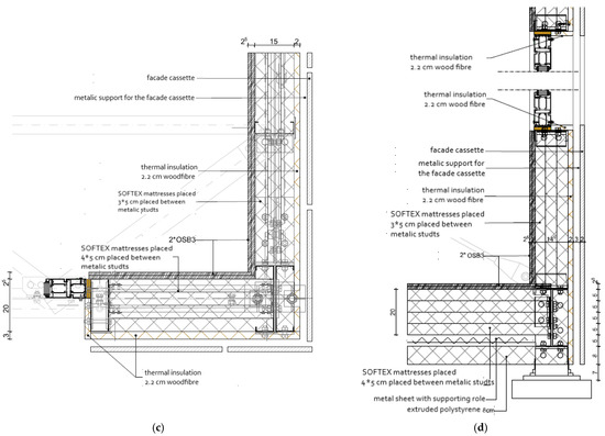 The structure is proper for various building envelope configurations. The unidirectional thermal resistances Rtot and unidirectional thermal transmittances Utot were calculated based on the constructive details for the envelope components presented in Figure 6. The solutions were chosen with respect to local sourcing and production of building materials, thus reducing transport emissions and associated costs.