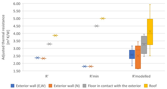 where A is the area of the element of the building envelope [m2], R′ is the adjusted thermal resistance of the building envelope element [(m2·K)/W] calculated as a reversed U′ value based on Expression (4). The value is similar to the transmission heat transfer coefficient coefficient [W/K] that is calculated with the following formula [40],