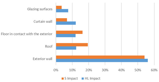 As it is previously shown in Table 5, the roof, as well as the ground floor above the crawl space, are underperforming with a direct negative impact on the energy performance consumption and energy rating. A parametrisation was done to assess the impact of each building envelope component on the energy performance in terms of heating. The parametrisation was done for the case described by a South orientation of the curtain-wall, a ventilation rate n = 0.5 h−1 and a heating system defined by a water radiator 70°/40 °C with a η = 87%. The considered case scenarios and the associated results are presented in Table 9.