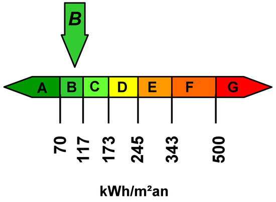 The energy consumption for heating from heat delivery to heat production as well the energy rating is established based on Equation (14) and the energy scale for heating (i.e., as defined by the Romanian norm) [43]: