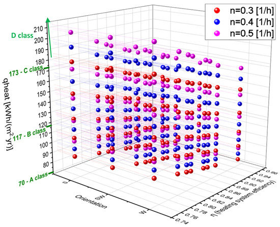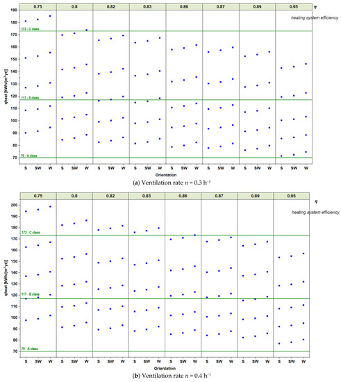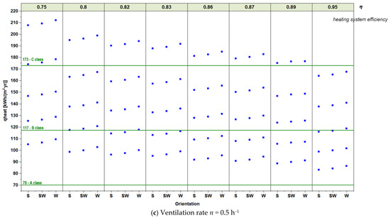 The South orientation is the most favourable for the considered location and façade design when looking at solar gains. Nevertheless, even for a maximum solar gain for the 5th climatic zone, in the case of a n = 0.5 h−1 and η = 95%, the qheat = 163.99 kWh/(m2·yr) corresponds to a C energy class for heating. In contrast, for a poorer heating system efficiency of η = 75%, the qheat = 207.72 kWh/(m2·yr) describes a D energy class for heating.