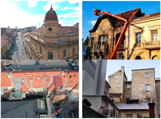 - Stepinac, M.; Lourenco, P.B.; Atalić, J.; Kišiček, T.; Uroš, M.; Baniček, M.; Šavor Novak, M. Damage classification of residential buildings in historical downtown after the ML5.5 earthquake in Zagreb, Croatia in 2020. Int. J. Disaster Risk Reduct. 2021, 56, 102140. [Google Scholar] [CrossRef]