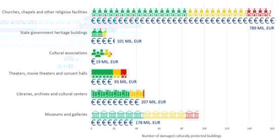 According to [1], 72% of buildings in the historical center of the city suffered significant damage due to the earthquakes in 2020 according to preliminary assessment results. The majority of the buildings in the city center are residential buildings followed by cultural institutions and state and government buildings and are, more or less, under heritage protection. The total number of the earthquake-affected non-residential buildings under heritage protection comprises 192 cultural institutions, 13 state government heritage buildings, and 159 sacral religious buildings. Since most of the buildings in the sector are very old masonry buildings with load-bearing walls, columns, arches, and vaults of various shapes, moderate to severe structural damage was suffered by 118 buildings (32%), and heavy structural damage was reported in 41 buildings (11%). The total damage according to the World Bank report to buildings and other physical assets in cultural sector is estimated at 1.38 billion EUR [22]. Figure 3 shows the number of damaged heritage buildings and the total financial damage according to the World Bank report.