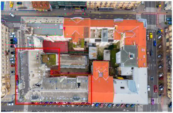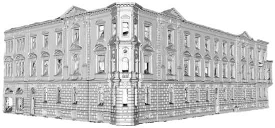 As the building is under heritage protection, special rules and integrated geometric survey for the conservation should be applied [26]. Similar to the paper by Milić et al. [27] a detailed survey of the external dimensions and façade was created to preserve its architectural value. The aerial view of the building is shown in Figure 4 and Figure 5. Laser scanning was performed with the Leica BLK360 device and processed in the Cyclone Register 360 software (Figure 6).