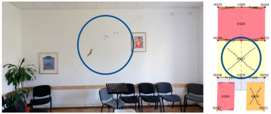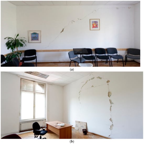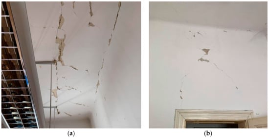 - 2nd floor: more damage was detected than on the first floor, as can be concluded from Figure 11. The damage pattern is quite similar, with most of the damage being cracks and plaster decay. More severe damage was detected in wooden ceilings and load-bearing walls. Most of the cracks are diagonal or in an X-pattern, with some being longitudinal across the wall. These longitudinal cracks are typical for locations where there is a difference in the materials used or where electrical wiring is placed. Another type of cracking is found on the second floor. In the locations where, throughout the years, openings or doors were closed, excessive damage may be found (Figure 11). These types of cracks appear due to the differences in material used for the construction of the wall and the material used for bricking up a door or an opening in the same wall. This type of damage is very typical in old masonry buildings. Most of the damaged parts of the second floor need to be inspected with more detail.