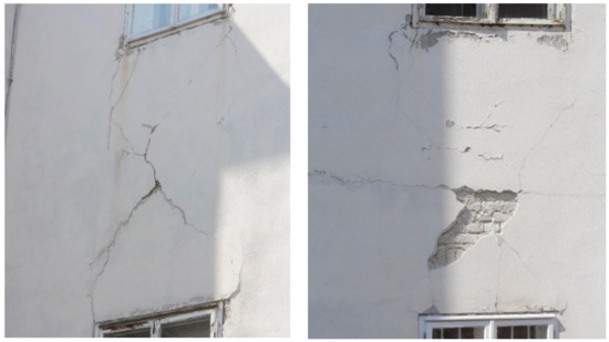 Figure 8. Diagonal X-pattern cracks on parapet walls between the first and second floor. - Cracks on load-bearing walls and cracks on walls where previous interventions were made, such as bricked-up doors (Figure 9a,b)