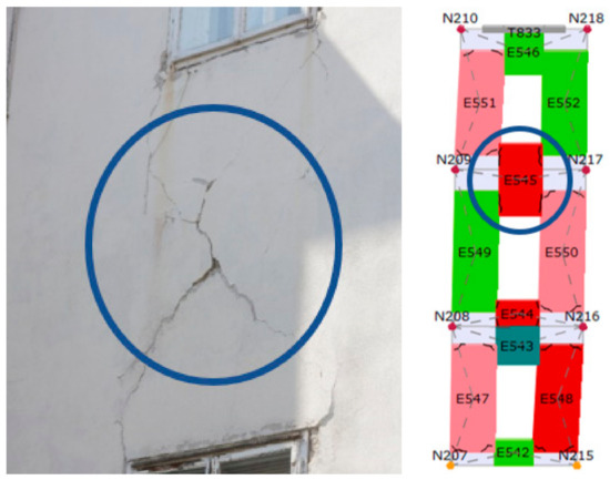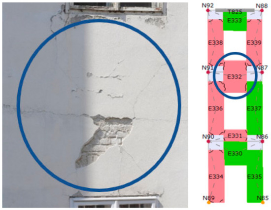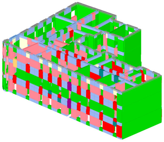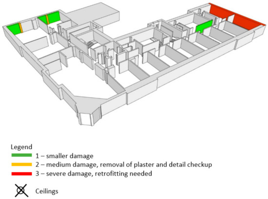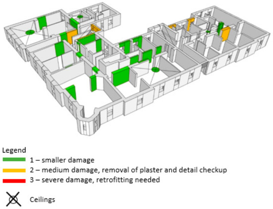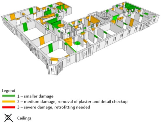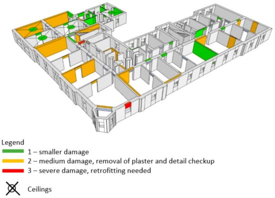 All damage that is found in the building is photographed and described. Besides that, every type of damage is plotted in the building’s 3D schemes according to their severity (Figure 10, Figure 11, Figure 12 and Figure 13). The green color (smaller damage) represents all types of damage where there is no need for a detailed check-up. Small local damage of plaster, local cracking on walls where the openings were bricked up, very thin cracks etc., fall into this category. The yellow color (medium damage) represents all types of damage where the plaster should be removed, and a detailed check-up is needed such as for the diagonal cracking of load bearing walls and severe cracks on parapet walls. In the end, the red color (severe damage) represents severe damage of structural elements where retrofitting methods must be used. This way, how the building behaved during the earthquake may be obtained.