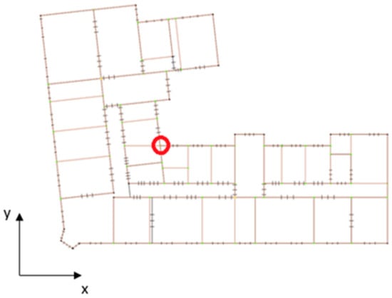 Furthermore, in the model itself, a couple of simplifications were made. Firstly, the horizontal loads for the pushover analysis need to be applied at the location of the center of the masses at each floor level. Since the floor plan of the building is very complex, the location of the center of the masses was approximated. The position of this node on the top floor is shown in Figure 15. Additionally, because of the complex floor plan, the roof was not modeled. Fortunately, in the seismic analysis the roof may be excluded as a load-bearing structure since it does not significantly affect the structure’s seismic response and does not contribute to its resistance. The contribution of the roof for the static and seismic analysis was considered a static load on the structure.