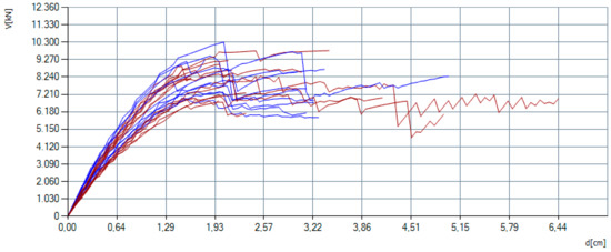 In 3Muri12 software, a non-linear static pushover analysis is used. This method allows a comprehensive insight into the critical elements and sections of the building, local failure mechanisms that may occur and the global behavior of the building as a whole. The basic principle of this method is that the vibrations of the building are assessed only in the two translational directions. The analysis is performed with constant gravitational loads and a monotonous increase of the horizontal loads. When it comes to the horizontal loads, two distributions are used in the pushover analysis. The first distribution is represented by a uniform pattern across the building’s height. The second one uses a modal pattern distribution where the horizontal load is distributed along with the building’s height proportionally to the first vibration mode shape of the building determined through the elastic analysis [39,40]. Overall, there are three main failure modes of masonry walls [41,42,43]. In unreinforced masonry structures, the usually dominant failure mode is the diagonal cracking failure [44]. This type of failure is known as the Turnsek–Cacovic constitutive law. In 3Muri12 software, the dominant failure mechanism is chosen in the material properties. For this case study building, the Turnsek–Cacovic law is chosen.