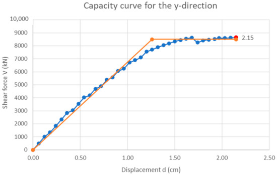 After the structure’s response, the capacity of the structure is obtained. Moreover, checks are carried out according to the basic requirements related to the state of structural damage defined by limit states. The parameters for the equivalent Single Degree of Freedom (SDOF) systems from Figure 19 and Figure 20 are shown in Table 2. These parameters are obtained during the bilinearization of the capacity curves in the x and y directions.