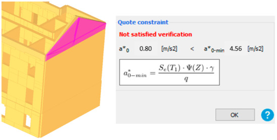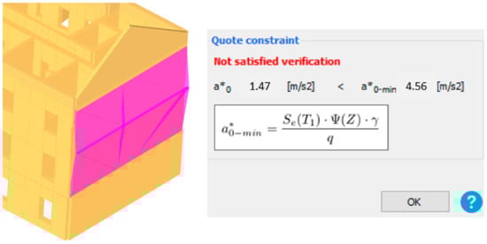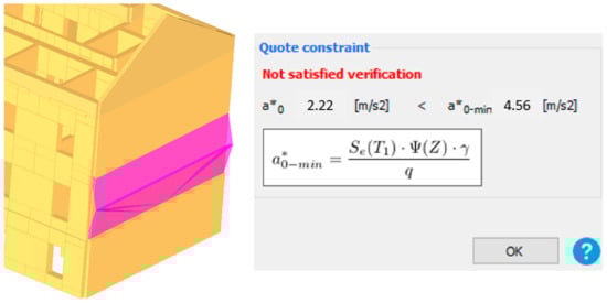 In the pushover analysis, the 3Muri12 software does not include the bending failure of walls in the out-of-plane direction. Thus, an analysis is performed where a seismic action perpendicular to the wall is taken into account. This analysis can only be performed for the near collapse (NC) limit state with a return period of 475 years, even though the “Law on the Reconstruction of Earthquake-Damaged Buildings in the City of Zagreb, Krapina-Zagorje County and Zagreb County (NN 102/2020)” [55] states that this return period is used for the limit state of significant damage (SD). In Figure 21 the walls that did not act satisfactorily are colored red. As it may be seen, most of the walls in the case study building satisfy this analysis.