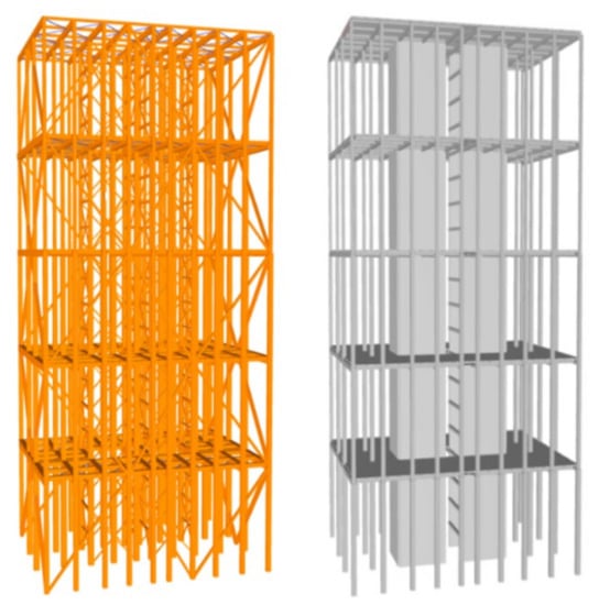 Two different 20-story hyperstructures were designed and modeled by using finite elements: one using glulam with external and internal bracings and another one using reinforced concrete with two internal cores. The two systems were designed in such a way that five 4-story light-frame modular substructures could be inserted. For the timber hyperstructure, glulam was preferred to CLT as an initial choice, because using the latter would have resulted in a duplication of the walls already present with the light-frame modules. The software used was RFEM [].