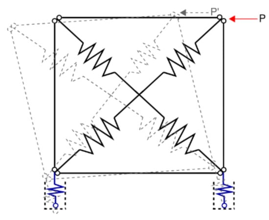 The chosen model needed to be relatively simple and able to represent shearwalls deflections in multi-story buildings, as calculated in Article A.11.7.1 of CSA O86-19 []. Hence, only the substructures shearwalls and floors are modeled (Figure 3). All other elements normally composing prefabricated light-frame modules (studs, sill plates, headers, etc.) are not modeled, and the gravitational loads pass through the columns. A new model was developed based on the modified macro-element model of Chen et al. [] in which the diagonals had hysteretic stiffnesses based on the Bouc–Wen–Baber–Noori model. For this study, the diagonals were modified as non-linear members to link with the equations of Article A.11.7.1. The concept, illustrated in Figure 4, consists of pinned frames composed of rigid beams and columns (in black). The lateral rigidity of shearwall segments is represented by diagonals with non-linear stiffnesses. Elongation of the wall anchorage system is represented with rigid connectors having linear stiffnesses in compression and tension (in blue).