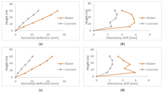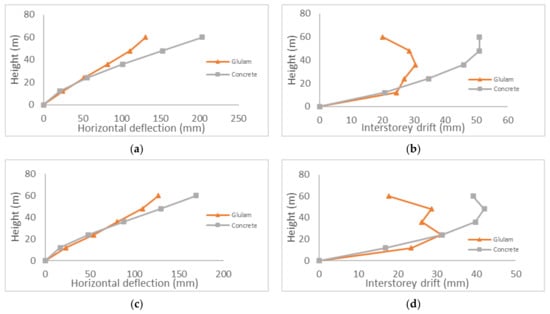 For the glulam concept, the lower limit of 90% of mass participation was reached with the first two modes. For the concrete concept, the first three modes were needed to reach 90% mass participation. The final seismic base shear for the glulam and the concrete in the N–S direction was 2038 and 1867 kN, respectively. In the E–W direction, the base shear was 1975 and 1807 kN. Total deflections and interstory drifts under seismic loads are presented in Figure 6a–d. In this study, interstory drift was defined as the differential lateral deflection between the hyperfloors. Even if the interstory drifts varied between the concepts, the limit drift of 0.025 Hn was never reached. The maximum interstory drift was 17% the limit prescribed by the NBCC.