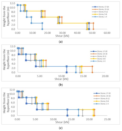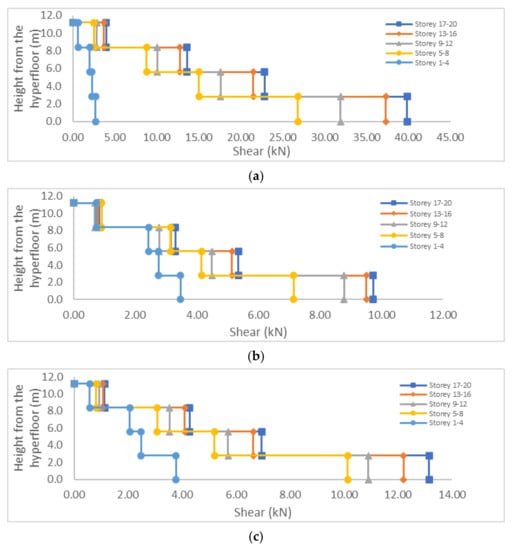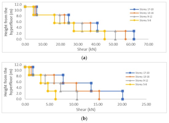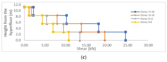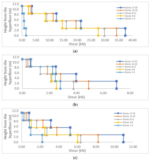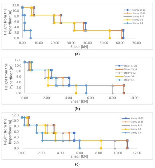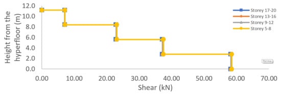 As expected under seismic forces, the higher the substructure, the higher the shear forces. For the shearwall segments of 3.0 and 3.5 m in the E–W direction that were mostly only stressed in shear under seismic loads, there could be a different design of shearwall configuration in the different substructures, with stiffer walls going up. For the shearwall segments of 3.475 m in the N–S direction, this would not be possible, since, for the shearwalls of substructures 5–8, 9–12 and 13–16, the shear induced from the deflection of the hyperfloors under gravitational loads was higher than the shear from seismic loads. For the substructures 17–20, the shear in the shearwalls under seismic loads exceeded the shear from gravitational loads by a maximum of 9.3%. Thus, for the shearwalls in the N–S direction, a uniform configuration between the substructures would be more adequate. For all substructures, the interstory drift under seismic loads was less than 40% of the limit of 0.025 Hs prescribed by NBCC [].