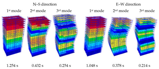 With the substructures participating to the LLRS, the structure was more rigid, and the periods of the modal vibrations were shorter compared to the model with the substructures modeled as linear loads. In the N–S direction, the first mode period decreased by 0.114 s (−7.5%), the second mode decreased by 0.006 s (−1.9%) and the third mode decreased by 0.030 s (−17.5%). In the E–W direction, the first mode period decreased by 0.353 s (−24.0%), the second mode decreased by 0.025 s (−7.8%) and the third mode period decreased by 0.010 s (−7.0%).